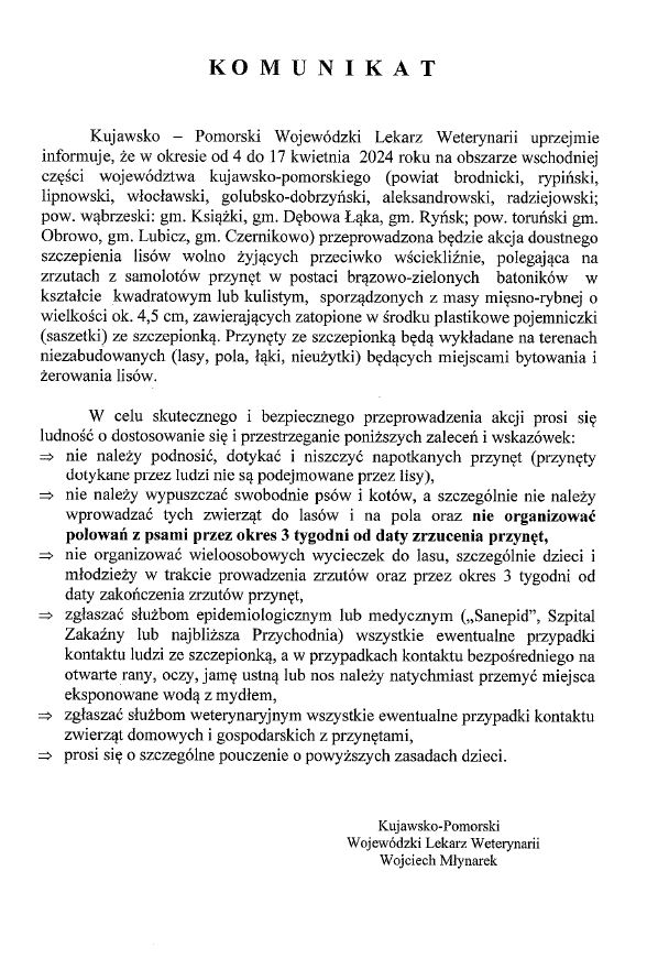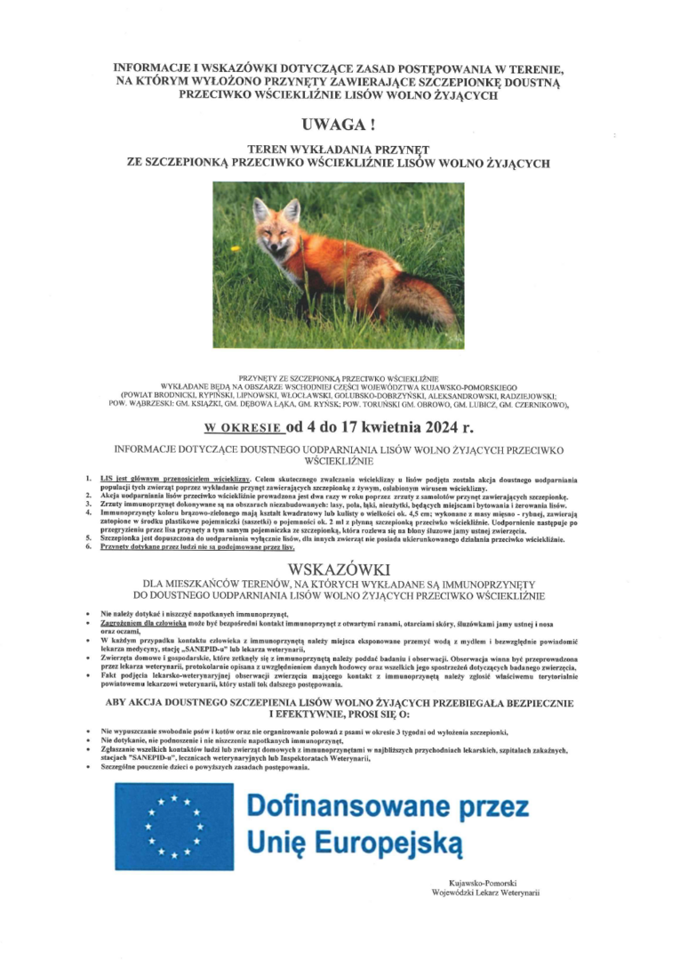 Uwaga! Teren wykładania przynęt ze szczepionką przeciwko wściekliźnie lisów wolno żyjących