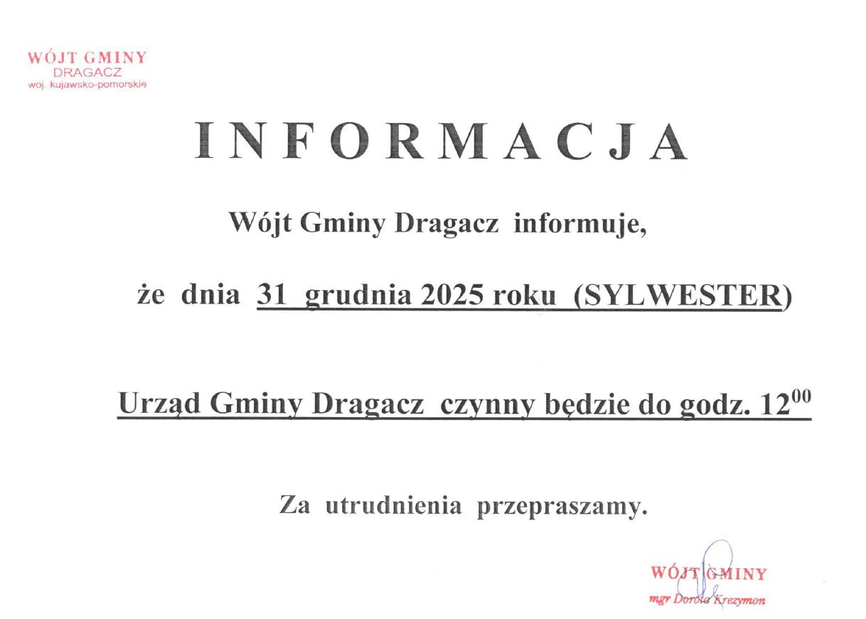 Informacja o godzinach pracy Urzędu w dniu 31.12.2025 roku